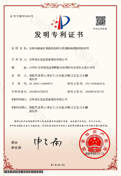 (《安神补脑液在制备防治阿尔茨海默病药物中的应用》发明专利证书)