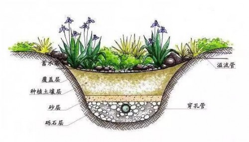 雨水花园作为海绵城市落地的细胞体,它通过自然形成或人工挖掘的浅凹绿地汇聚来自屋顶或地面的雨水,再通过植物、沙土的综合作用使雨水得到净化,并使之逐渐渗入土壤,涵养地下水。雨水花园既拥有其他类型花园的功能、形式和艺术感,又具备收集雨水、涵养水源等功能。不仅能有效解决社区雨水的收集、存储和利用等一系列问题,也能为社区健康可持续发展创造更多的可能。