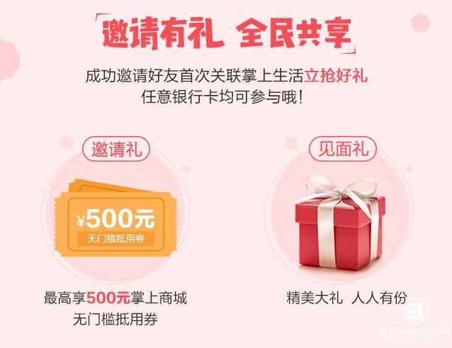 并且,今年的“10元风暴”还有“邀请有礼·全民共享”活动,客户通过掌上生活App成功邀请好友绑卡,与好友可分别获得精美邀请礼和见面礼。