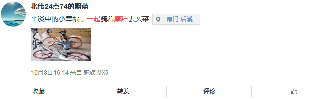 甚至有人把摩拜写到了诗意十足的愿望里:下次下次,一定要和喜欢的人去看一场电影,和喜欢的人去吃我最爱的泡芙,和喜欢的人去旅行、唱歌,和喜欢的人一起骑摩拜,把我的故事都讲给他听。”简单又文艺的生活,摩拜单车充当了重要的角色。