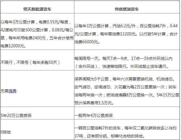 从上面的表格中可以看出,与传统柴油货车相比,恒天新能源货车的优势主要有五点: