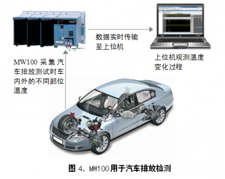 在汽车排放测试中,需要记录多个温度参数,包括车内外的环境温度、冷却水温度、润滑油温度、机油温度、排气管温度等。可以使用MW100对车体不同部位的温度进行监测和记录。其优势在于: