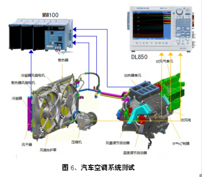 在汽车空调系统的测试中,要同时记录多种不同的传感器信号,包括控制电压信号、电流信号、车内温度/湿度、水流量、空调吸排气压力及温度、中冷进排气、散热器进出口压力及温度、大气压力、日照强度等。这些信号大多数可以用MW100来记录,但是控制信号这类高速信号就需要用DL850来进行记录。
