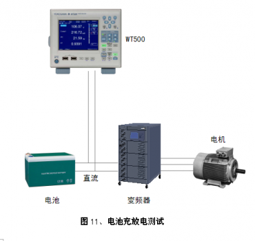 电池是电动汽车的核心部件之一,电池的充放电性能关系到整车的性能。使用WT系列功率分析仪可以判断电池的充放电状态,测量充放电电流的有效值,并通过对电流的积分,得到充电的电量和放电的电量,以及充放电时间。