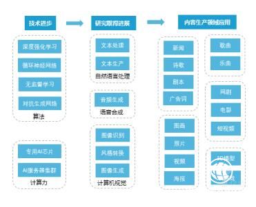 技术进步和产业内生需求,是推动AI开始在内容生产领域应用的两个主要动力。机器生成内容的研究很早就在持续进行,随着人工智能技术的应用,开始取得突破性进展。近两年,无监督学习、深度强化学习、迁移学习、生成对抗网络等算法的研究深入,使得AI在本文处理、音频处理和图像处理方面持续取得突破。