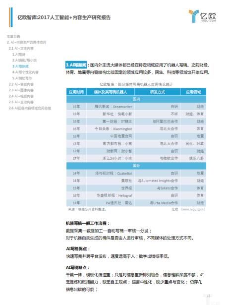 为了弄清AI+内容生产进行到何种程度,对内容生产可能产生何种影响,亿欧智库撰写了这份《2017 人工智能+内容生产研究报告》,对目前AI在内容生产领域的应用进行了研究,分析了AI在文本、音频、图像、视频、互动内容五大领域的具体应用情况,展望了AI在内容生产中应用的发展趋势,供相关人士参考。
