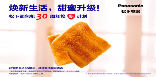 今年还是松下面包机进入中国市场的30周年!除了发布30周年纪念款面包机,还为大家带来了一个重磅福利——“松下面包机30周年焕新计划”!凭任意品牌面包机,换购松下指定型号面包机,即可享受最高600元优惠!