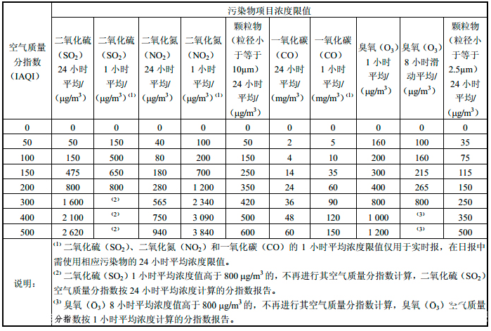 空气质量指数AQI是把多种空气污染物(二氧化氮、二氧化硫、臭氧、一氧化碳、细颗粒物、可吸入颗粒物)的浓度,转化为一个由0至500的单一数字。其中0~50、51~100、101~200、201~300和大于300,分别对应国家空气质量标准中日均值的 I级、II级、III级、IV级和V级标准的污染物浓度限定数值。I级,空气质量评估为优,对人体健康无影响;II级,空气质量评估为良,对人体健康无显著影响;III级,为轻度污染,健康人群出现刺激症状;IV级,中度污染,健康人群普遍出现刺激症状;V级,严重污染,健康人群出现严重刺激症状。