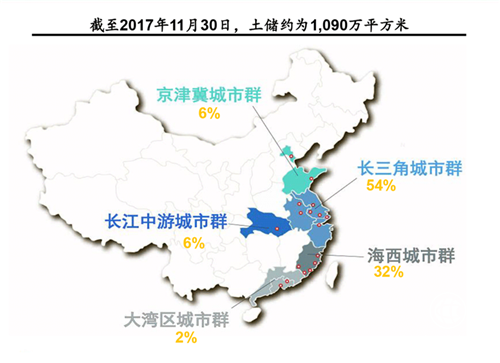 禹洲地产的土地储备中有54%分布在长三角,33%位于海西。据申万宏源研报显示,以权益可售面积计算,公司拥有土地储备排名前五的城市分别为漳州(16%)、合肥(14%)、武汉(10%)、苏州(10%)、泉州(9%)。