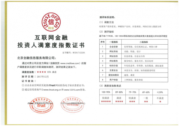 日前,经过国内权威信用认证和测评机构iTrust(简称“网信”)互联网信用评价中心严格综合评审和征信调查,凤凰钱包获得企业信用AAA等级认证,并获得“互联网金融客户满意度四星证书”,投资安全受肯定。