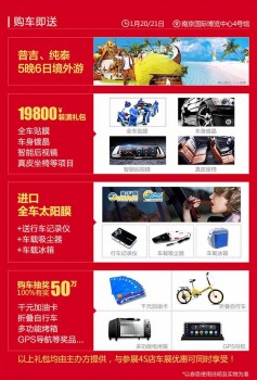 约好时间,带上家人一起来1月20-21日南京博览车展上进行更加全面的体验和对比吧,现在提前报名还有惊喜礼品等着你来领取! 百度搜索:麦车网,报名车展团购客户,报名免门票,享1000-5800元团购优惠+4S团购大礼包!享车展团购底价!到场即送精美上门礼一份!