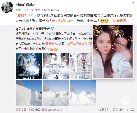 1月12日,黑龙江省旅游委在新京报上通过整版内容,将雪雕老人的故事和他的收信地址透露给大家,听说,他已经陆续收到了一些爱情来信啦!