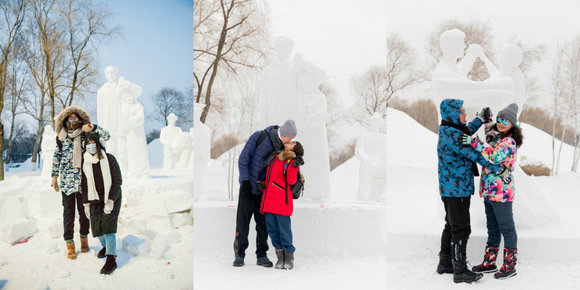 有些情侣效仿身后的雪雕,或紧紧相拥,或甜蜜亲吻,在镜头前大肆秀了一把恩爱。有些全家出动的游客,则在苍茫一片中拍摄了一张意义非凡的全家福。