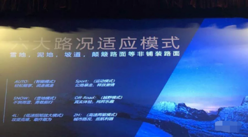 共集成了6种模式:Auto智能模式、Sport运动模式、Snow雪地模式、Off-road越野模式、4L低扭矩放大模式、2H高速两驱模式。