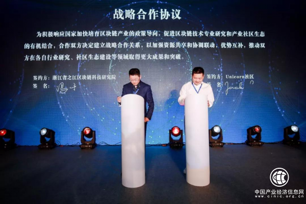 会上,浙江省之江区块链科技研究院与Unicorn社区、浙江省之江区块链科技研究院与四川长虹通信科技有限公司、四川长虹通信科技有限公司与杭州振荣电子商务有限公司还分别签署了战略合作协议,以加强平台资源共享和协调联动,优势互补,共促区块链技术研发和生态建设。
