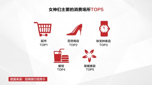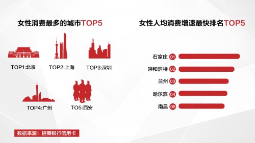 女性持卡用户消费金额最多的城市TOP5依次为北京、上海、深圳、广州、西安。而在消费升级趋势下,石家庄、呼和浩特等三四线城市的女性消费增速迅猛。