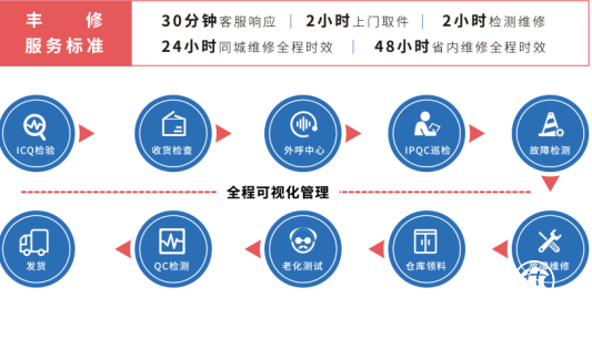 丰修通过将售后工厂设立在顺丰覆盖全国的物流中心,集成“售后中心”与“物流中心”,可大幅节省货品在路途中的中转时间。无须中间环节的时间浪费,货品一到达顺丰物流中心,即可在丰修工厂8小时完成检测、退换及维修服务,每日收发班次达到12次,实现“同城24小时,同省48小时”的售后时效。