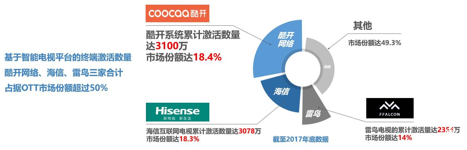 据《报告》数据显示,2017年中国OTT终端保有量为2.65亿台,同比增长24.4%;激活数量1.68亿台,同比增长30%。基于智能电视平台的终端激活数量,酷开网络、海信、雷鸟三家合计占据了OTT市场份额超过50%。其中,酷开系统以18.4%的市场份额领跑行业。截至目前,酷开网络累计激活终端数以达3484万。