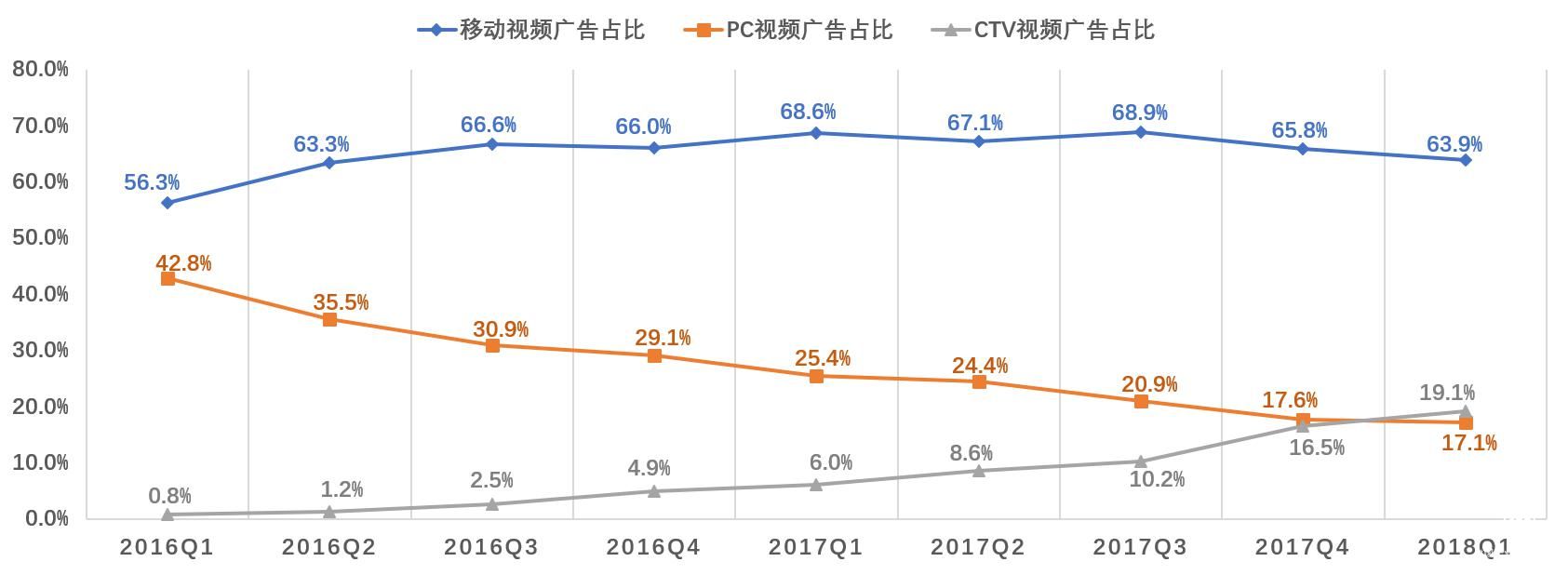 《报告》数据显示,在互联网广告领域,2017年第一季度智能电视广告占比为6%,远不如PC视频广告的25.4%;而到了2018年第一季度,智能电视广告占比已经达到19.1%,超越了PC视频广告的17.1%。