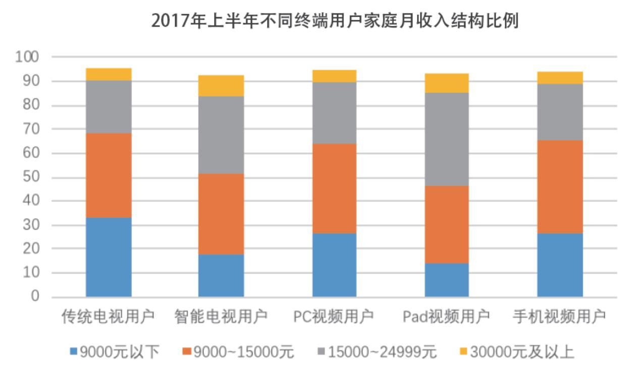 相较于传统电视用户,智能电视用户年龄构成更加年轻化,而且消费能力更高。据《报告》中的数据显示,智能电视的用户结构与Pad视频用户结构类似,大学及以上学历所占比重超60%,企事业单位管理人员所占比重超35%,家庭月收入在15000元以上的占比超过40%。