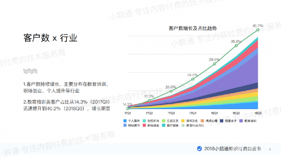 另外,客户数增长较大的行业主要分布在教育培训、职场创业、个人提升等行业,其中教育培训类客户占比从14.3%迅速提升到40.2%,增长明显。