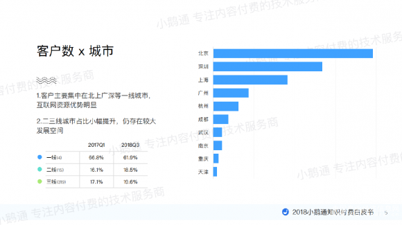 在区域上,客户主要集中在北上广深等一线城市,互联资源优势明显,而二三线城市占比小幅提升,仍存在较大发展空间。例如三线城市客户占比从2017年Q1的17.1%提升到2018年Q3的19.6%。