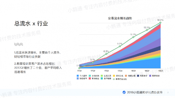 从流水上看,总流水增长最快的主要由个人提升、财经楼市等行业贡献;教育培训类客户流水占比相比2017Q1增了二十倍,客户平均收入迅速增长。