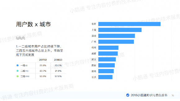 一二线城市用户占比持续下降,三四五六线城市占比上升,市场呈现下沉式发展。另外在2018年Q3,三线城市的用户占比达到了57.8%。