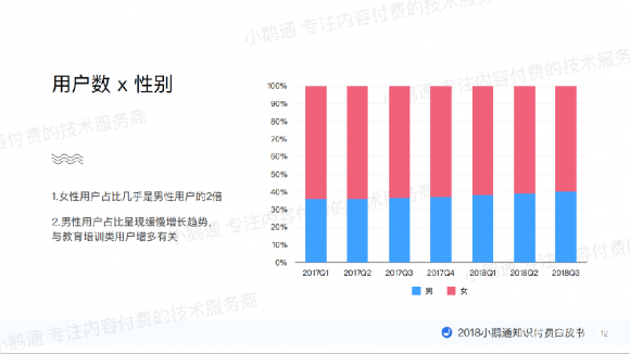 另外,从用户性别角度看,女性用户仍旧占比较大,几乎是男性用户的2倍。而男性用户占比呈现缓慢增长趋势,与教育培训类用户增多有一定关系。
