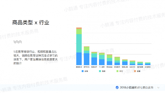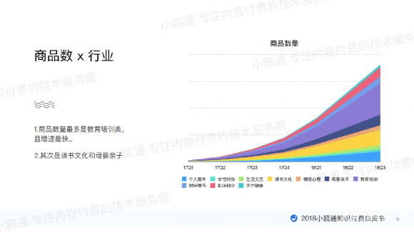 最后,小鹅通还分析了各行业知识商品数量情况,发现商品数量最多是教育培训类,且增速最快,其次是读书文化和母婴亲子。