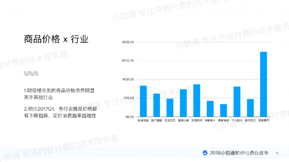 目前,财经楼市类的商品价格依然明显高于其他行业,相比2017Q1,各行业商品价格都有下降趋势,定价消费越来越理性。