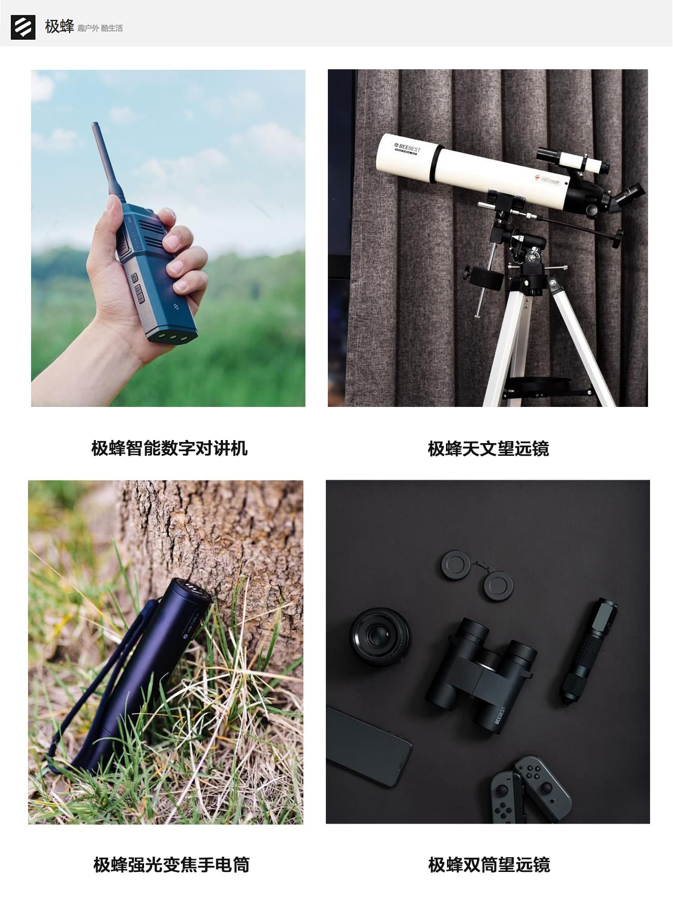 目前,极蜂品牌旗下拥有四款产品,分别是第一款极蜂强光变焦手电筒,以高亮度著称,CREE 1000流明进口灯珠,无级变焦设计,六挡模式一键切换,实现户外、家庭生活照明更多玩法;第二款是极蜂天文望远镜,拥有90mm物镜口径、高分辨率成像、天地两用、直接连接手机拍照等核心功能,关键是1199元的高性价比,能够让每一位天文爱好者能够探索浩渺星空,轻松做到“上观天文,下观街景”。第三款是极蜂智能数字对讲机,以其语音回放、高发射功率、支持蓝牙耳机以及手机写频等特色功能,进一步捍卫极蜂户外沟通技术的领先地位,达到户外运动及时沟通、趣味沟通的效果;第四款产品是极蜂双筒望远镜,8倍黄金倍率、超宽带多层镀膜、IP67级充氮防水,真正做到“望的广,看得清”,实现对未知世界的探索和洞察。
