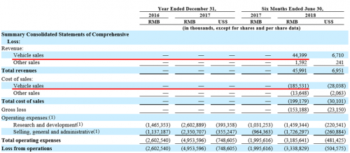 根据招股书数据,2018H1蔚来共交付481台ES8,取得营收4599.1万元(其中电动车销售收入4439.9万元),不过同期汽车销售成本1.86亿元,其中原材料和直接制造成本6740万元,远大于汽车销售收入,这样的收入成本构成引发“售价cover不住物料成本”的担忧。