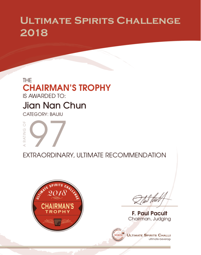 “终极烈酒挑战赛”(Ultimate Beverage Challenge)被誉为国际上最具权威的三大烈酒比赛之一,在2018年 “美国终极烈酒挑战赛”(ULTIMATE SPIRITS CHALLENGE)上,中国白酒共有50多款被选送并获得了不俗成绩。其中,剑南春以97分(满分100分)的好成绩,荣获最高奖“主席奖杯” (CHAIRMAN’S TROPHIES),让全世界的品酒师为中国倾倒,同时也位列参赛的中国白酒产品第一名。