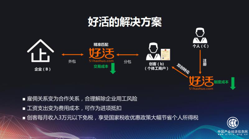 对于外卖平台第三方合作商而言,转变为商事合作关系,形成创新的组织管理模式,解除劳动关系风险,同时降低管理成本,降低骑手招聘成本,整体降低用工成本20%以上。而外面骑手转变为创客,进行大众创业,享受国家个体户3万以下月收入免增值税的优惠政策,且个体户可按国家要求自主选择缴纳社保和社保额度,而好活平台将对接社保、报销公司,在不大幅度降低外卖骑手辛苦收入的同时,为其提供安全保障。