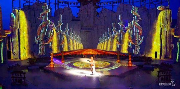 大型山体结构投影、主演区借鉴道教“八卦阵”进行整体投影,设有功能丰富的舞台升降系统及环绕水系统可营造雾森涌动、烟波浩渺、电光火石等实景场面。玄幻神奇的3D画面结合演员准确而生动的舞台表现力,把观众带到千年前的商周王朝。