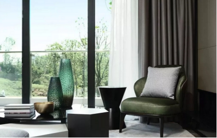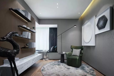呆在书房角落的绿色单椅,与整个空间若隐若现的绿色块相连贯,稳持着那独有的调性