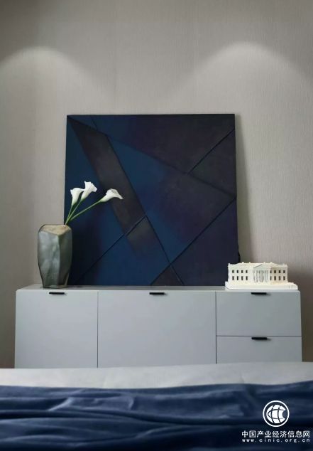 次卧的设计老道自如,青蓝色稳住了场面,在静谧的空间里,流露出笃定的暖意,装饰画潇洒而节制,配合的相得益彰。