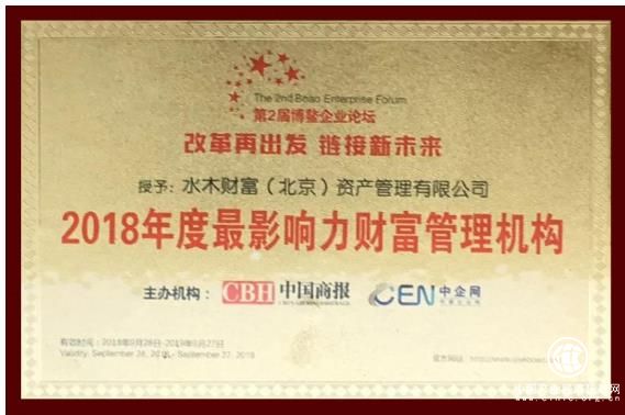 此次再次受到博鳌企业论坛的高度认可,喜获嘉奖,水木财富负责人刘艳华女士表示“水木财富作为一家资金实力雄厚、成就卓越的综合型财富管理金融服务机构,经过数年的发展与专业服务,服务网点已遍布北京、深圳、厦门、福州、安溪、南京、杭州、成都等地,同时,企业始终秉承’专业,诚信,发展,创新’的核心理念,充分挖掘与整合全球资本市场发展机遇与优质资源,坚持为中国高净值人群提供全球化、多视角、创新型的财富管理服务。此次再获’2018年度最具影响力管理机构’的荣誉称号,要特别感谢相关部门领导与合作伙伴的认可,更要感谢广大投资者的信任与支持,水木财富多年积淀及锐意进取所取得的骄人成绩,是社会各界对水木财富的最好回馈与肯定,这也将成为水木财富持续发展、不断突破自我的有力鞭策。”