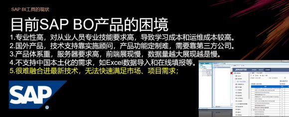 第四点就是它有一些本土化的需求是满足不了的,像我们在用系统过程当中总会有这样一些情况就是咱们不可能用系统满足所有的需求,总会有一些手工数据,那很多时候用户都会提出比如说我要求做excel导入,可不可以做在线填报,“对不起,BO都不支持”,这都是国外一些产品的这样一些问题。