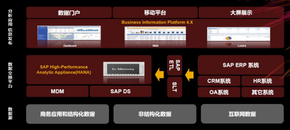 这个是SAP的BI解决方案,现在中国很多大型国企都是利用的SAP的解决方案,比如中石化、中石油、中粮。SAP BI主要的数据源是ERP,它也有相应的ETL的工具,包括实时的和非实时的采集工具。数据抽取后存放在数据仓库中,以前的数仓是BW,现在是BW on HANA或者是HANA,当然数据仓库也可以不用SAP的解决方案,也可以用Oracle等各种数据库。在数据仓库基础之上,会有BI工具这一层,就是SAP自己的BO。