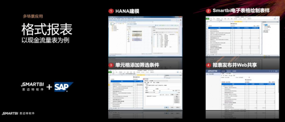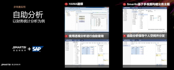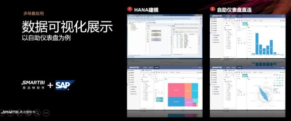 因此为了满足我的客户需求,我就开始推SAP数据仓库HANA+Smartbi前端工具的解决方案,Smartbi从企业最基本的格式报表到自助分析,再到数据可视化、到数据挖掘以及基础的数据采集平台,功能是很全的,所以说不用担心没有满足不了的前端的数据展现需求。