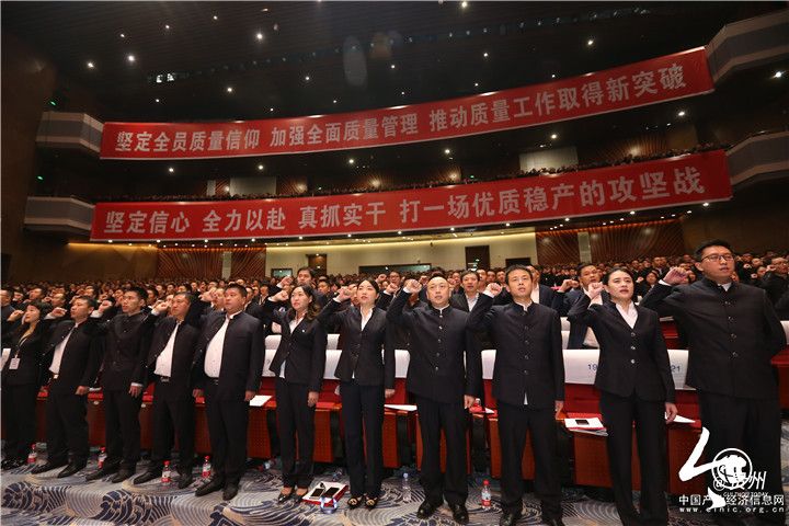 “率先垂范,求真务实 ,自强不息,伟业长青;以人为本,以质求存,恪守诚信,继承创新;崇本守道,坚守工艺,爱岗敬业,精益求精;牢记宗旨,团结奋进,弘扬国粹 不辱使命;追求卓越,持续改进,奉献社会,和谐温馨;爱我茅台,为国争光,承先启后,再立功勋”全体参会人员在茅台集团总工程师王莉的带领下,对2019年度生产作承诺宣誓。