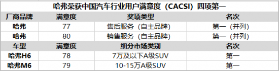 品牌奖项测评结果,哈弗品牌荣获售后服务满意度、销售服务满意度两项第一名。车型奖项测评结果,“国民神车”哈弗H6获得10-15万A级SUV用户满意度第一,累计4年获此殊荣;哈弗M6获得7万级以下A级SUV用户满意度第一名。