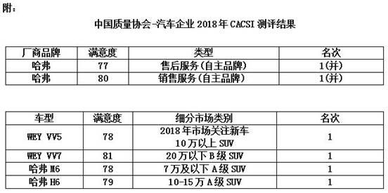在这次公布的“各品牌车型用户满意度测评结果”奖项中,长城汽车旗下四款车型分获综合满意度及关注度第一名,获奖数量之多位列所有参评车企首位,其中VV5以78分的成绩获得“2018年市场关注新车,10万元以上SUV组别”第一名;VV7以81分的成绩获得“20万元以下B级SUV”第一名;哈弗H6车型以79分的成绩获得“10-15万A级SUV”第一名;哈弗M6则以78分的成绩获得“7万及以下A级SUV”第一名。