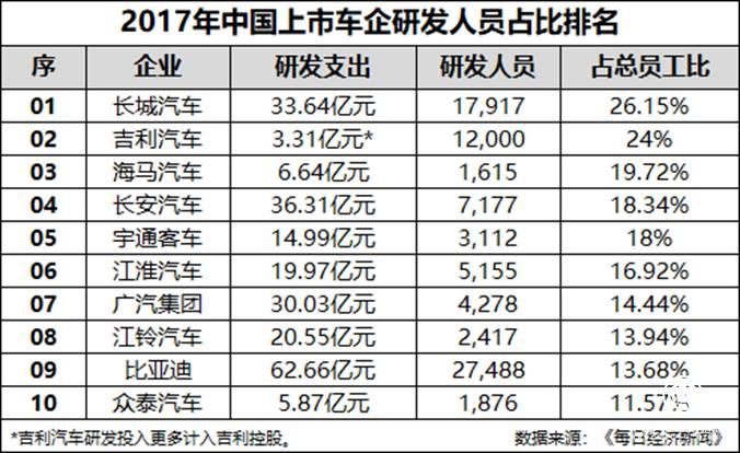 技术能力是制造企业的灵魂所在。在这方面,哈弗可以说是自主品牌中最花血本的。统计显示,长城汽车的科技人员占到所有员工的26.15%,超过1/4的员工都是科技人员。相比之下,长安只有18.34%,比亚迪只有13.68%,众泰只有11.57%。长城汽车在技术人员的投入上确实超过了很多自主品牌。