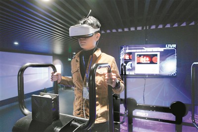 图片说明:用户在南昌VR产业园,利用VR设备进行地震体验,直观感受地震的效果。