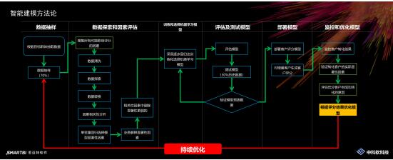 上图展现的是我们如何利用海量数据建立选取合适的数学模型的方法论。智能模型建立的好坏也是智能化应用的根本。针对某一个领域建立数学模型有一个前提条件就是需要有一定规模的海量数据,只有有了海量数据供我们选取及训练相关数学模型,模型的判断结果才能更加准确,否则模型的准确率会非常低,达不到我们的期望。下面我们来简单看一下这个方法论,首先我们确定了智能应用的领域,并且在这个领域有大量的数据,我们使用70%的数据进行数据探索,在这个环节中我们利用我们的行业经验及领域经验找到我们所有能找到的相关因子,根据这些因子,我们去训练并选择我们的模型,经过训练选择后确定模型,然后我们利用剩下的30%数据来评估模型,评估通过后进行部署并对已有数据及新增数据进行判断,模型部署后需要在相关在应用层面监控模型运行情况我这里以客户评分模型举例说明,分析模型运行的数据,并将分析结果反馈形成一个闭环的、持续优化的流程。这个就是我们中科软模型创建的方法论,也是我们构建智能化应用的基础。