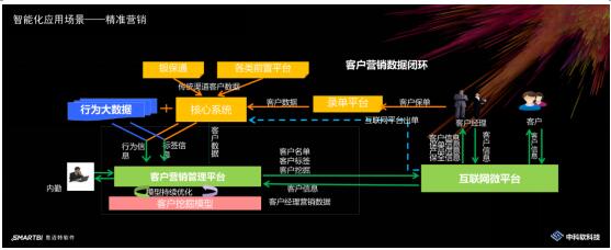 从这张图中可以看出,所有的营销数据、客户行为数据,以及所有的相关数据都会汇总到客户营销管理管理平台,由平台中的营销模型进行分析,最终将分析后的客户名单、客户标签反馈给相关的互联网平台,由客户经理根据反馈信息进行相关营销。客户经理的二次营销数据还会通过数据闭环流回到营销管理平台,平台根据这些信息进行模型的优化,使得整个精准营销应用是一个持续改进的过程。