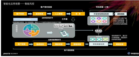 我们来看一下智能风控的应用场景,智能风控只要有两个环节的应用。首先是在新契约投保流程中,在自动核保及人工核保环节中嵌入不实告知风险监测,调用两核模型,实时监测客户的不实告知及逆选择倾向,降低人工工作量,同时将风险扼杀于事前;第二个是在理赔的核赔环节,在理赔审核及理赔调查环节嵌入智能两核模型,进行筛查,利用可抗辩期2年时效的保险规则,将已承保不实告知及逆选择倾向保单筛查出来,辅助案件的调查和审核。